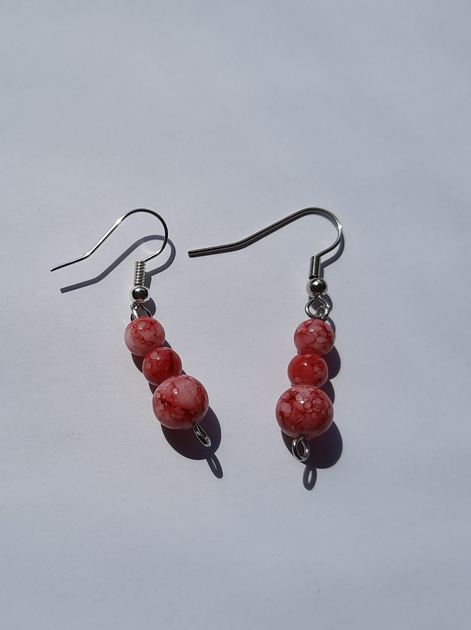 Schöne rosafarbenen Ohrringe aus marmorierten Glasperlen.