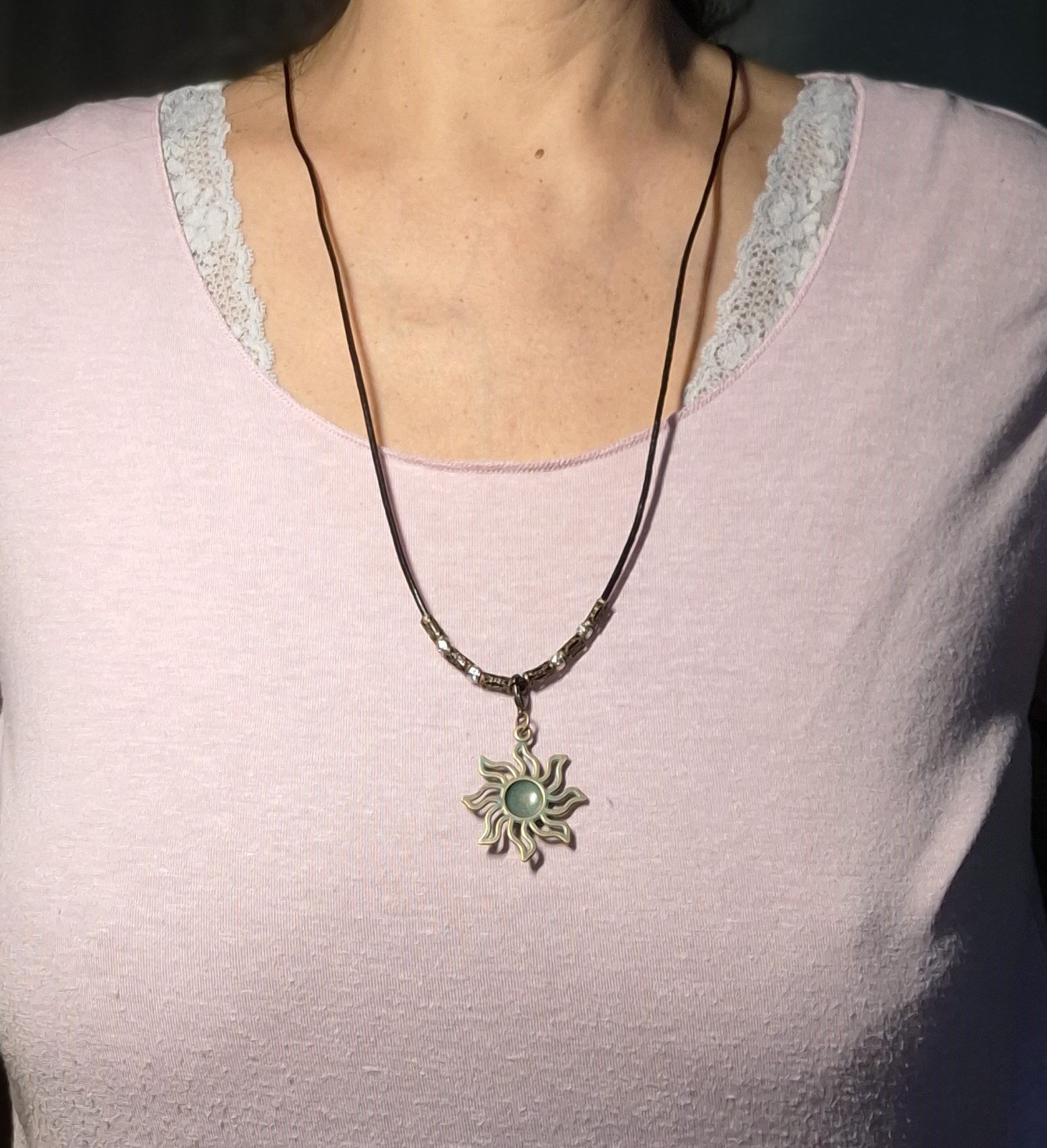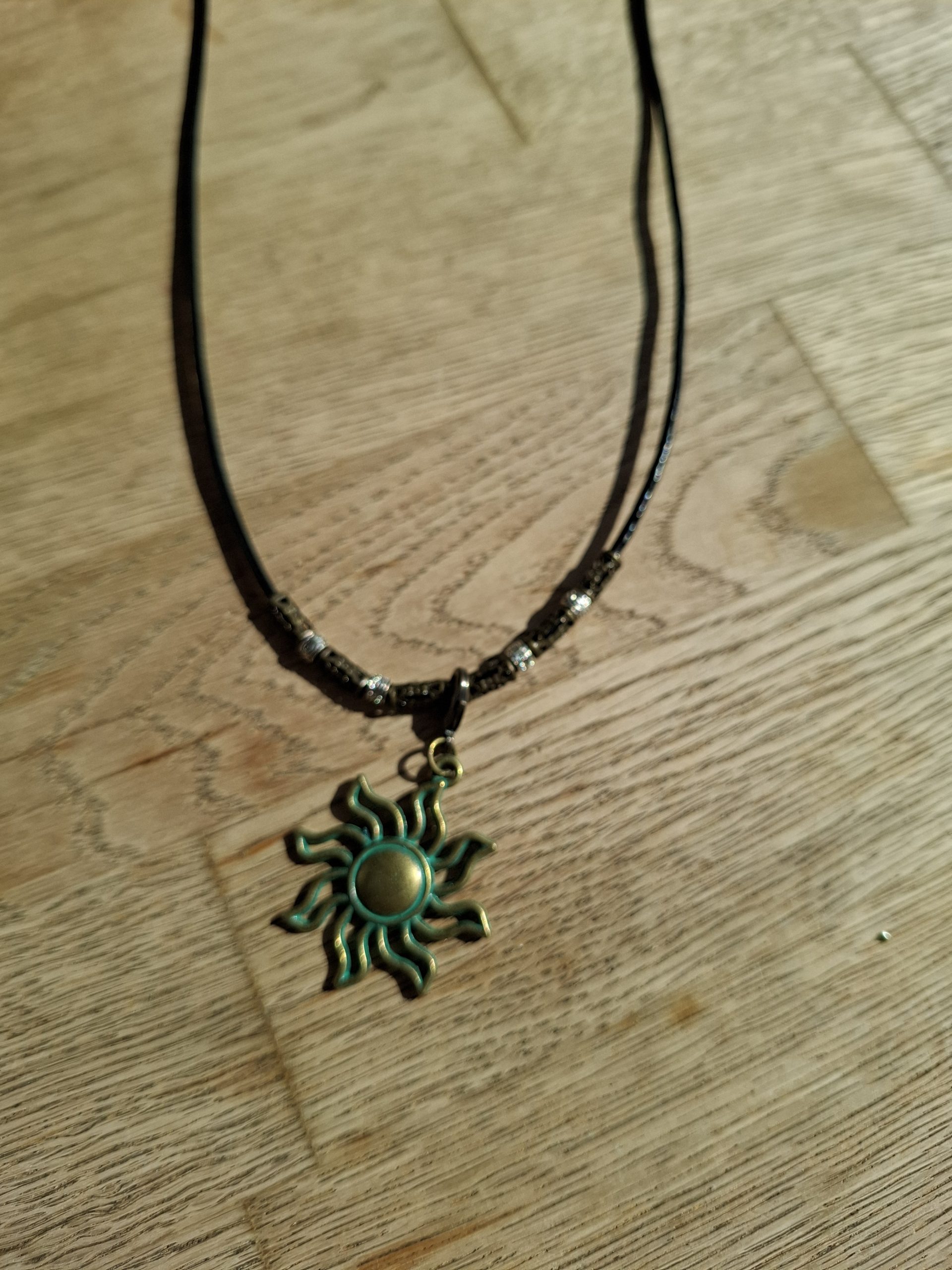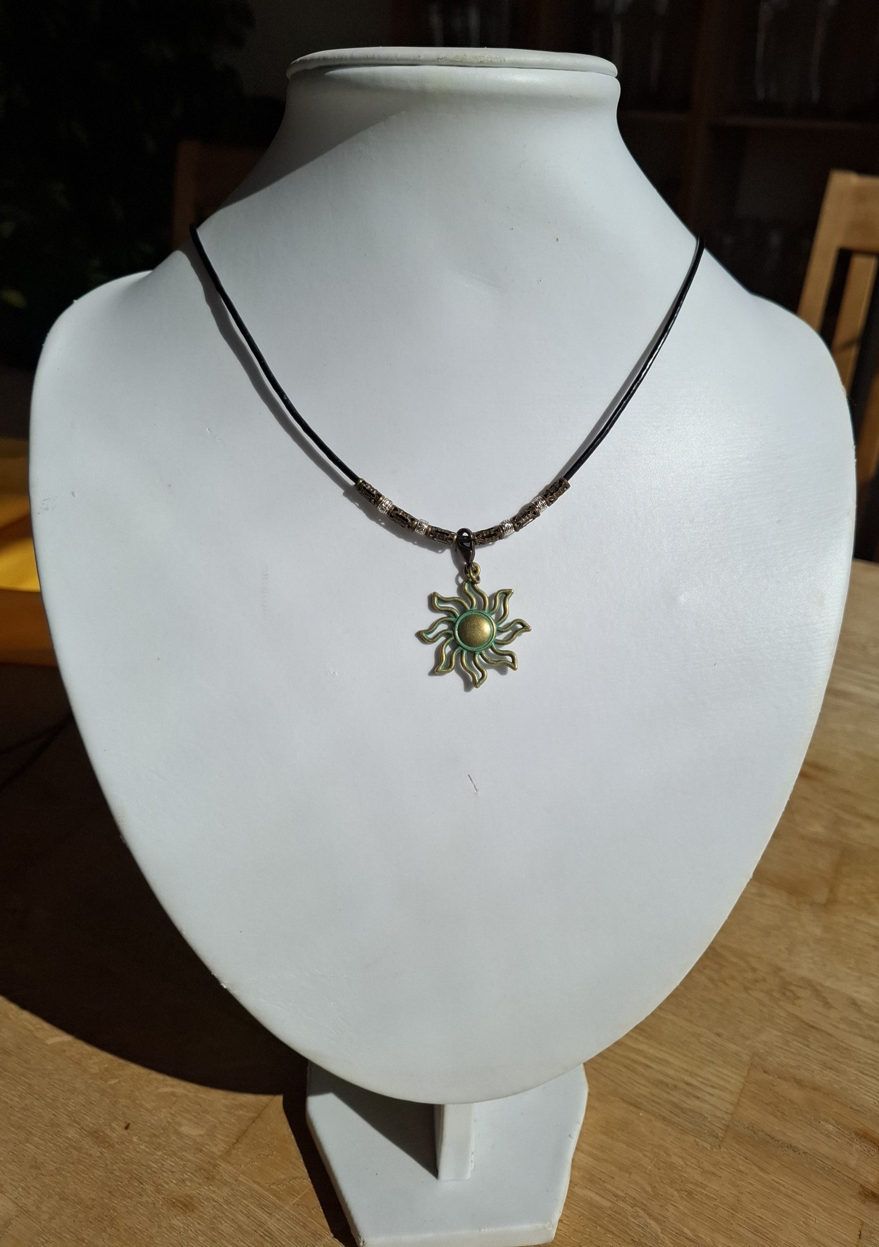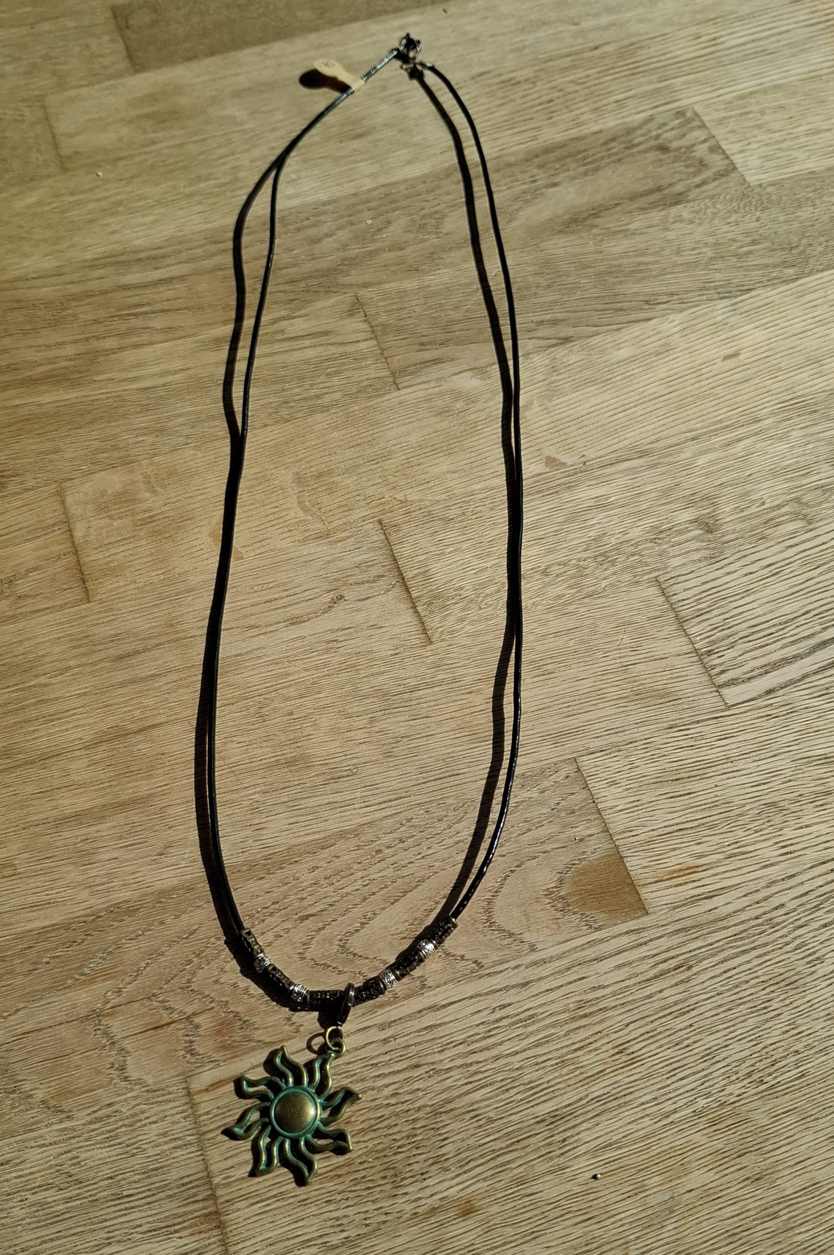 Diese Halskette besteht aus einem Lederband und hat als Highlight einen Anhänger, der aussieht wie eine kleine Sonne. Umrandet wird sie von schönen silbernen und braunen Teilen.