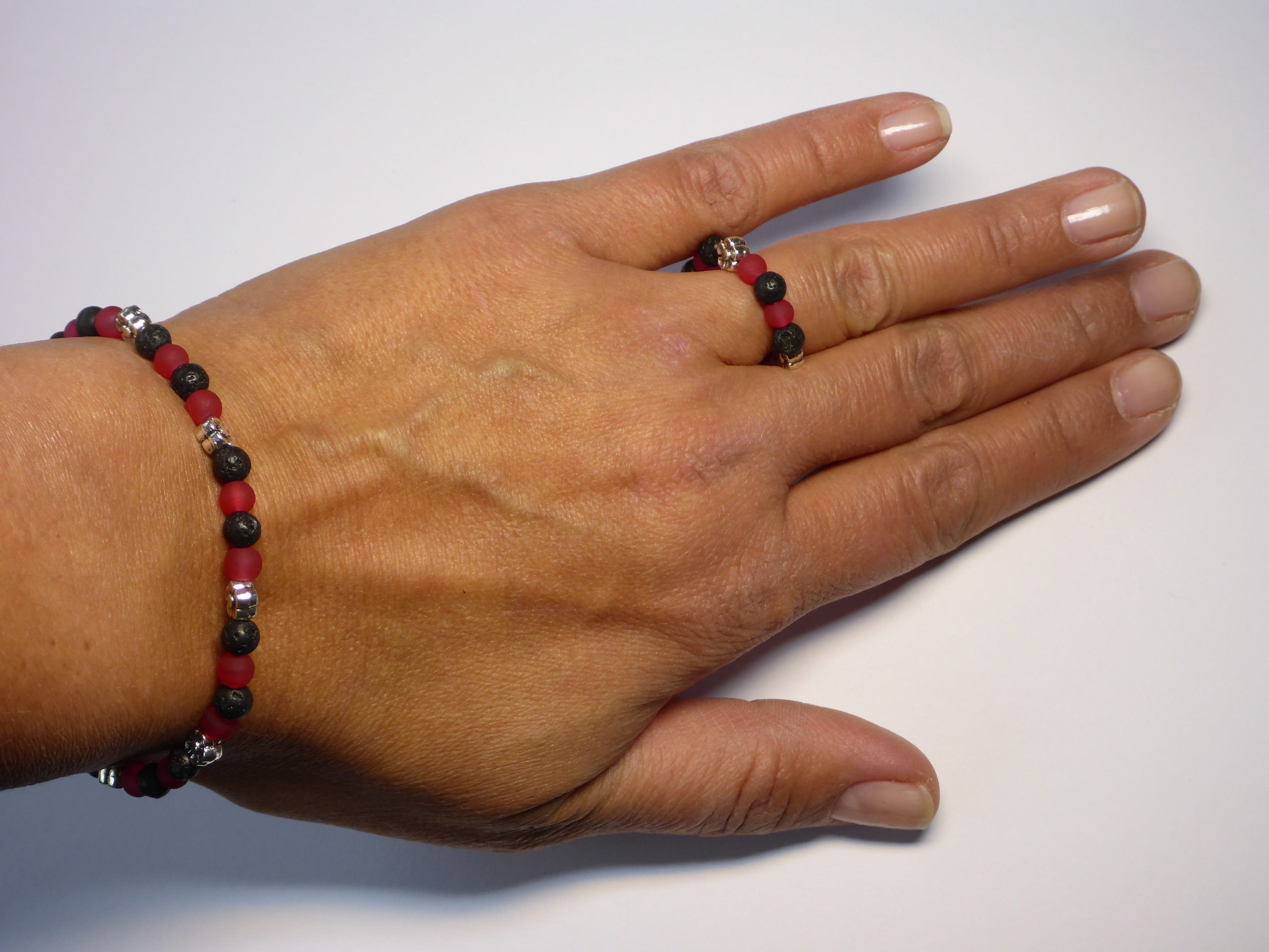 Farbe der Perlen: rot, schwarz mit typischer Lavastein-Struktur