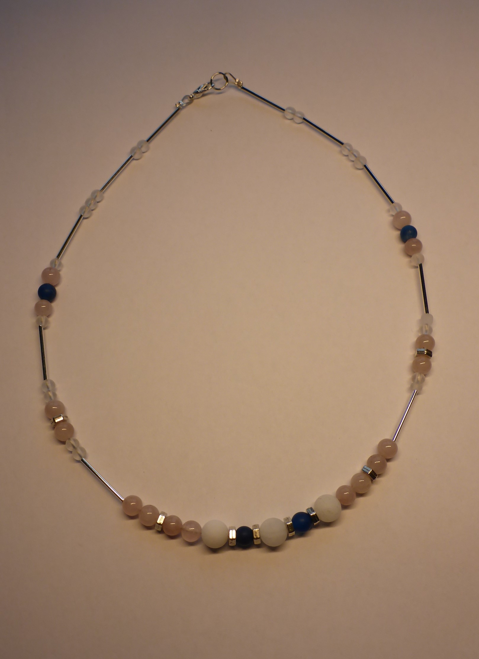 Schöne Halskette aus weißen Jadeperlen, Rosenquarz, blauen Achatperlchen und Glasperlen.