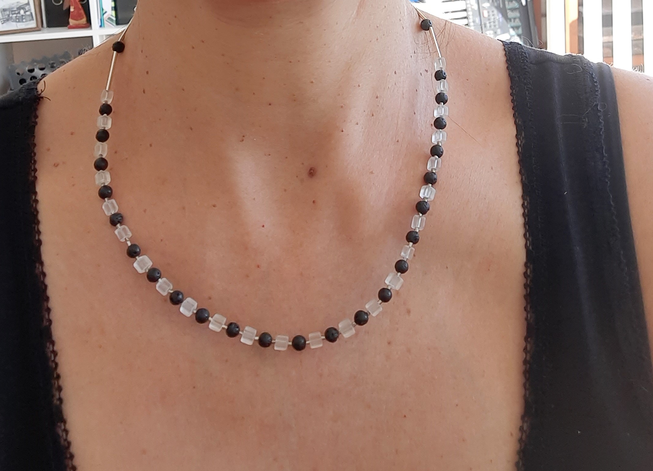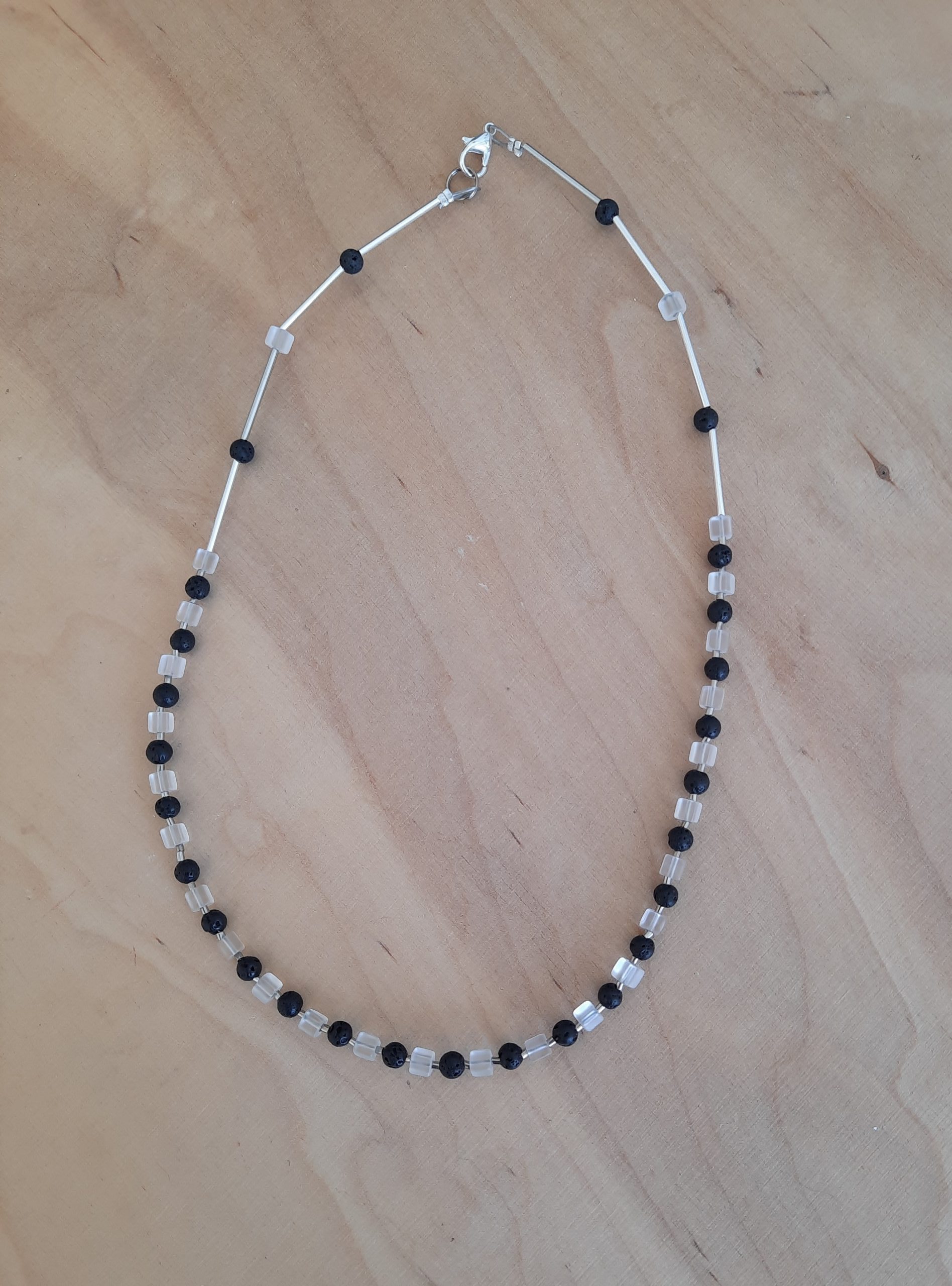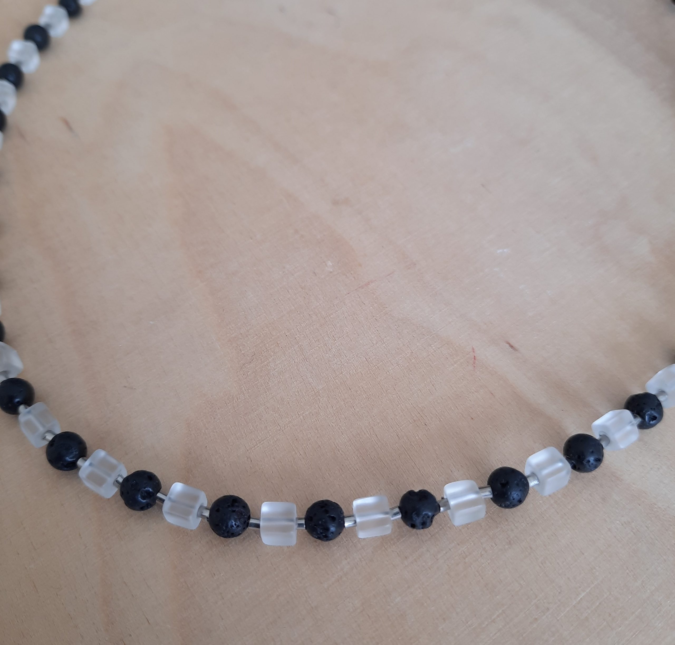 Diese Kette hat viele kleine Lavaperlen mit seiner einzigartigen Struktur. Umrandet werden sie durch transparente Glasperlenwürfel und dazwischen noch viele mini-Silberperlen.