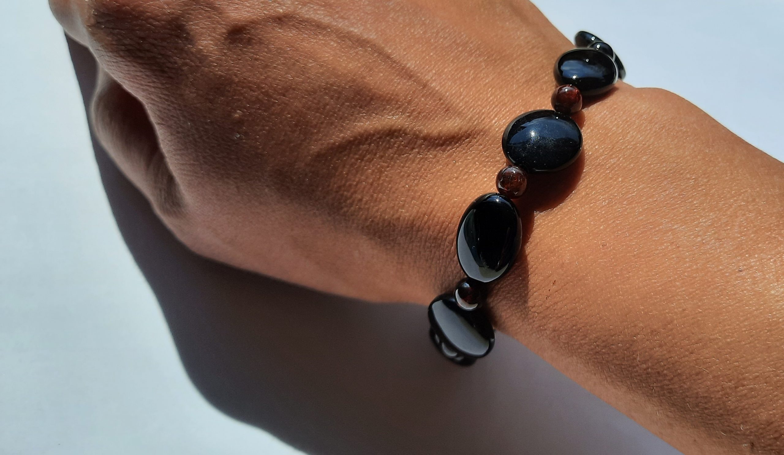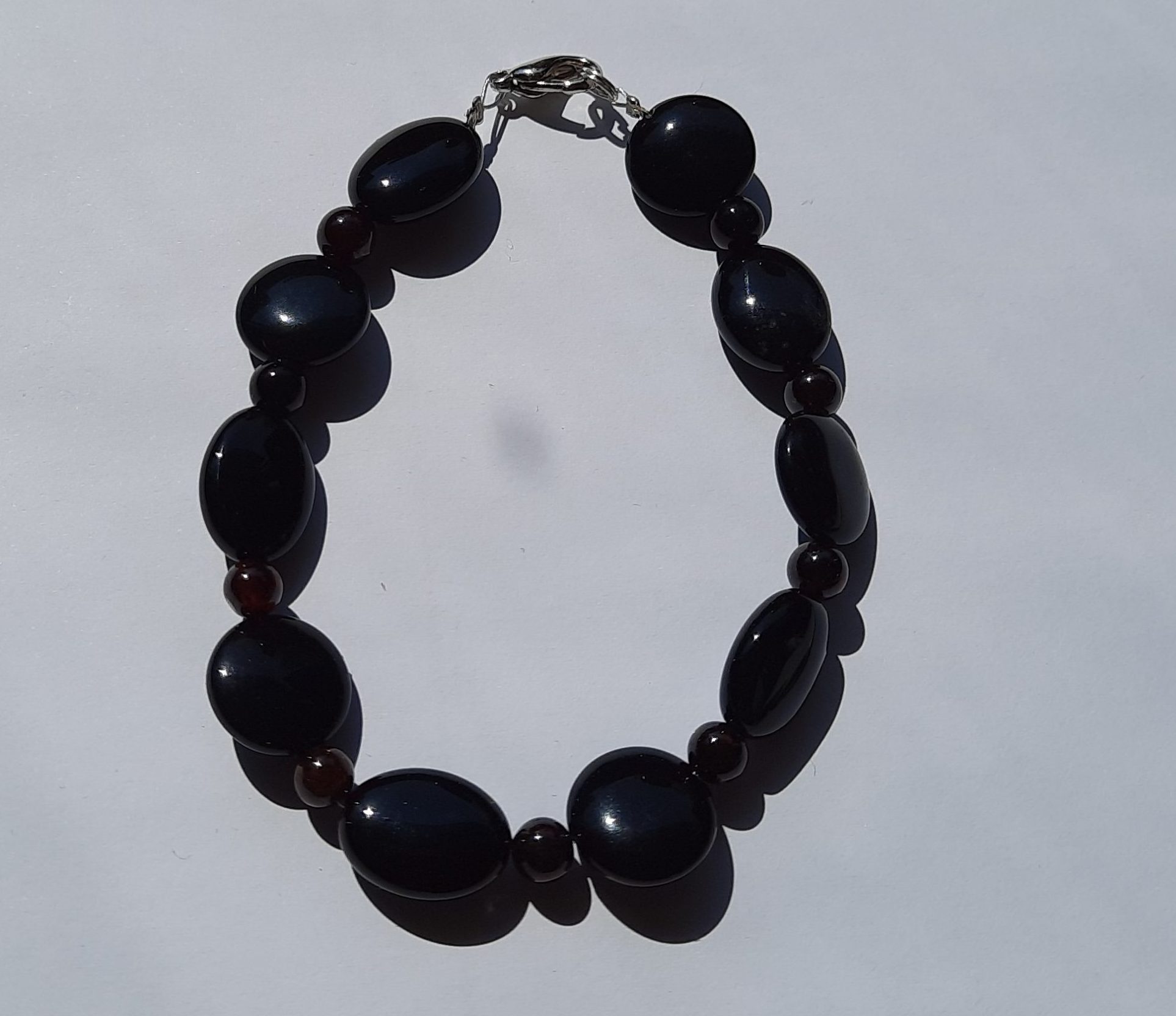 Schwarze Onyxperlen mit verschiedenen Formen machen dieses Armband zum Highlight.