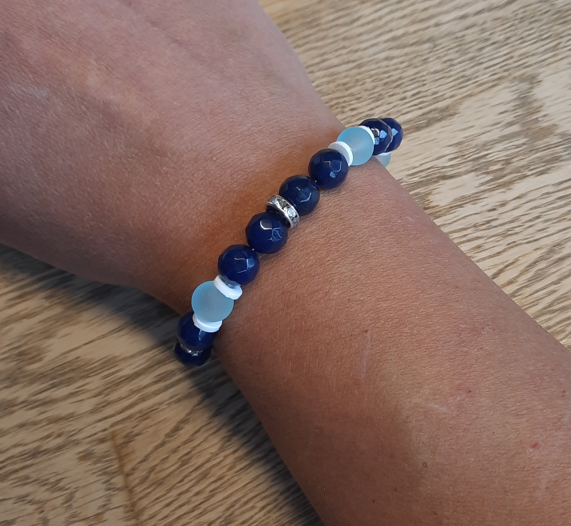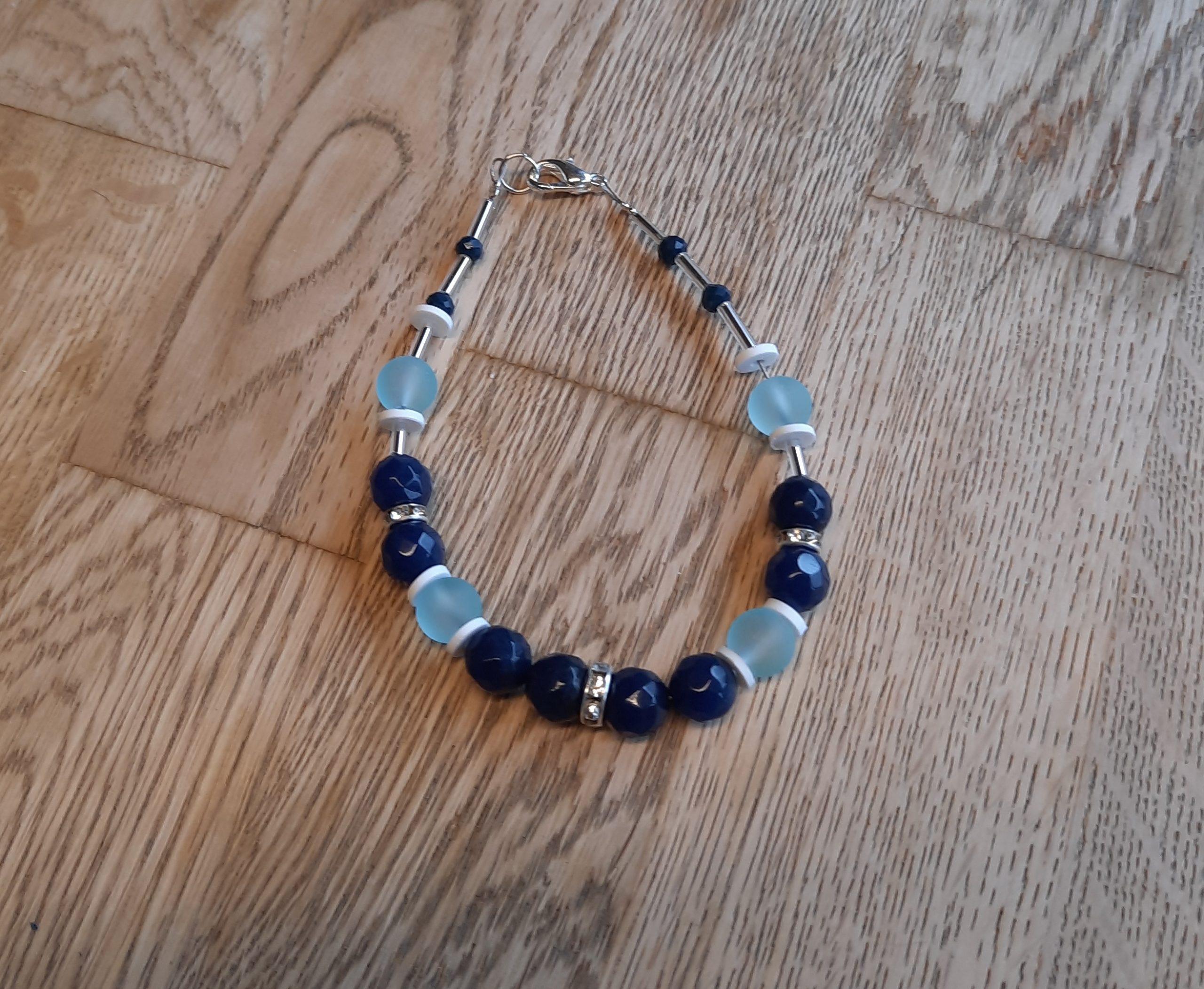 Diese Kette besteht aus dunklen Achatperlen, hellblauen Glasperlen und als Highlights mehrere silberne Strasssteine.