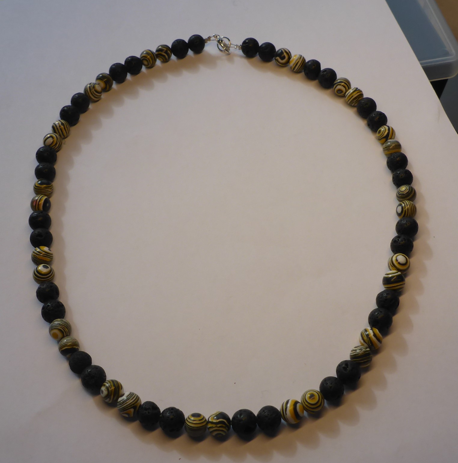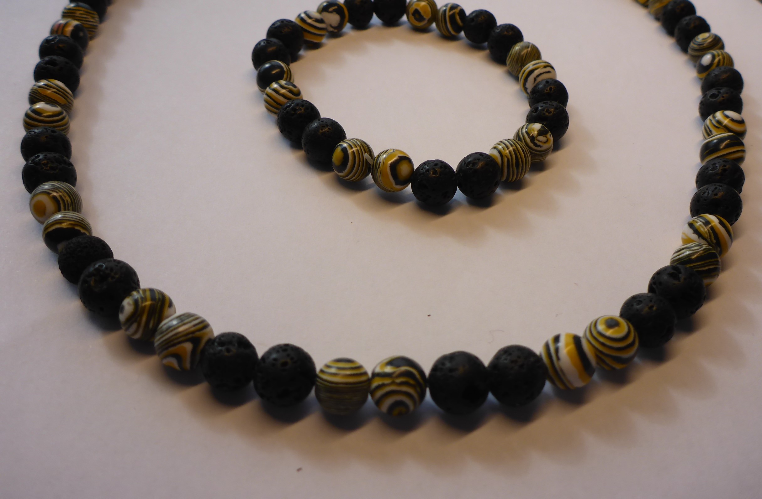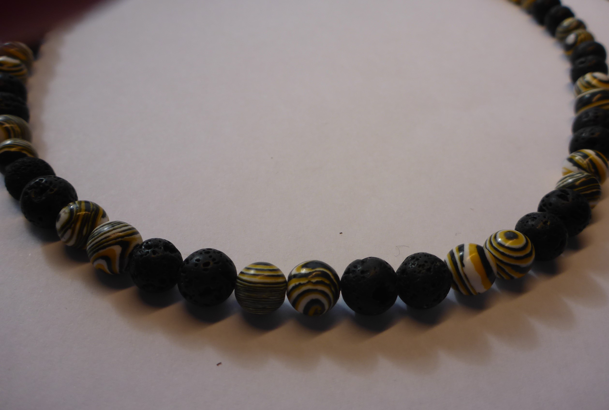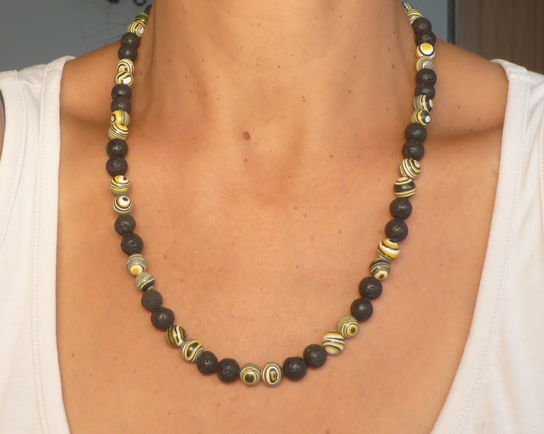 Schöne Halskette aus Malachitperlen in gelb-schwarz und schönen Natur Lava Perlen.