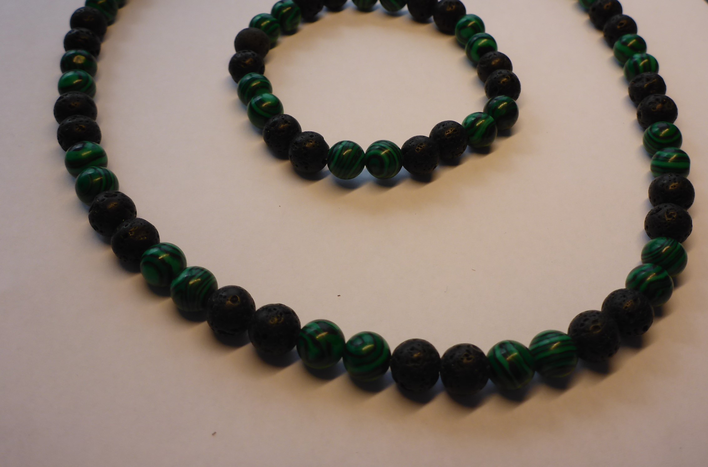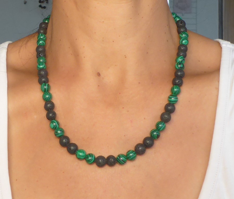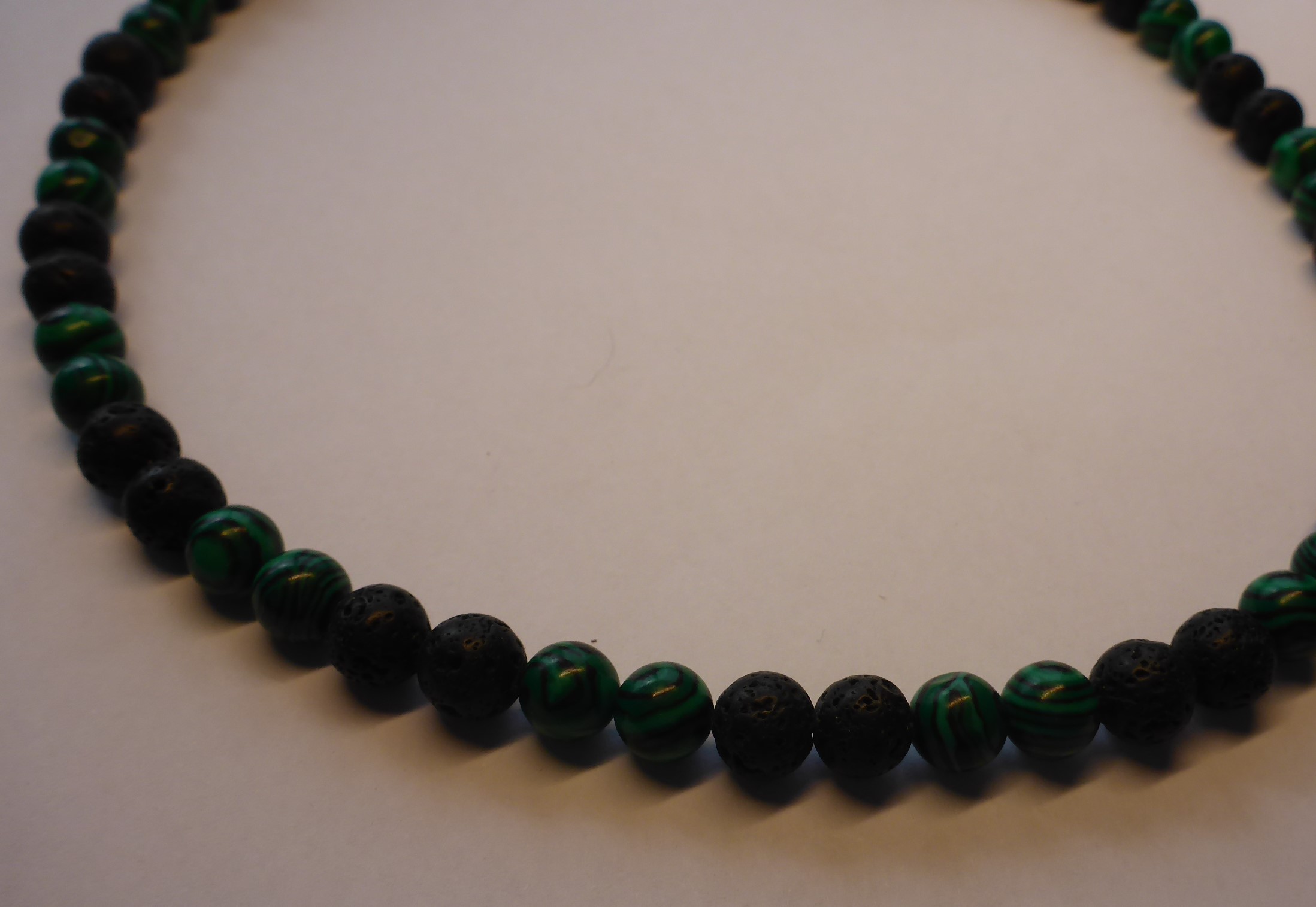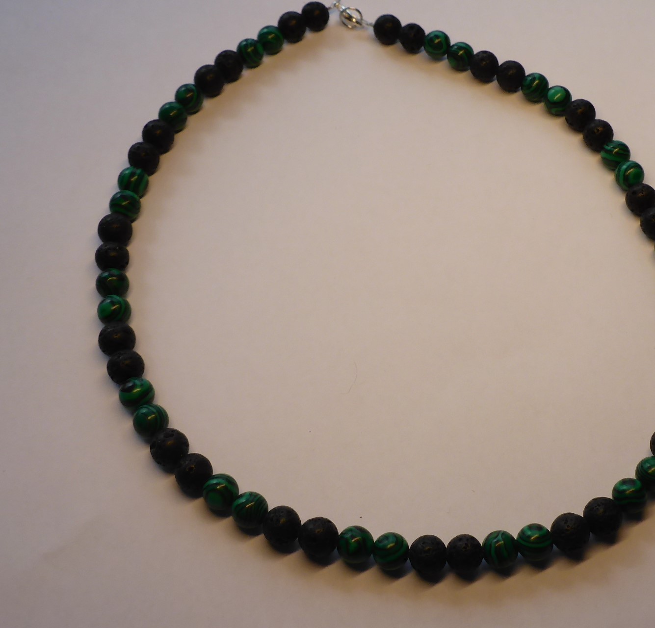 Schöne Halskette aus Malachitperlen in grün-schwarz und schönen Natur Lava Perlen.