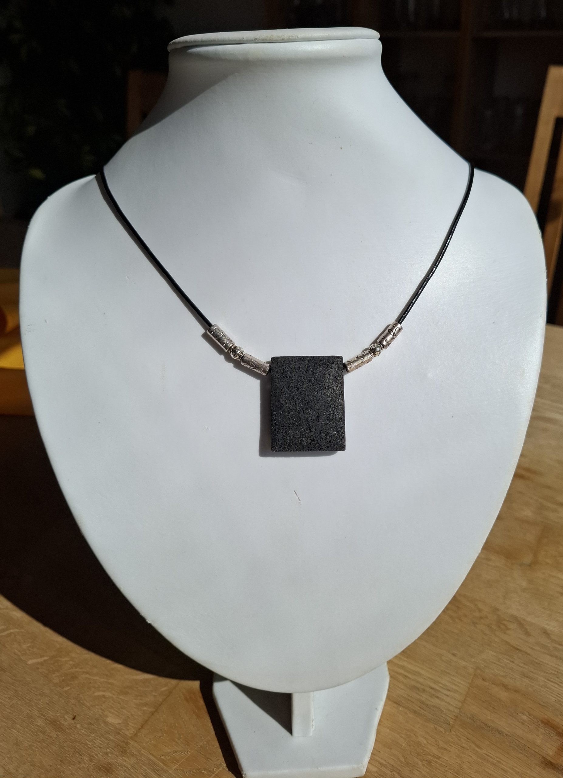 Diese Halskette besteht aus einem Lederband und hat als Highlight eine eckige Lavaperle. Die silbernen Teile machen sie zum echten Hingucker.