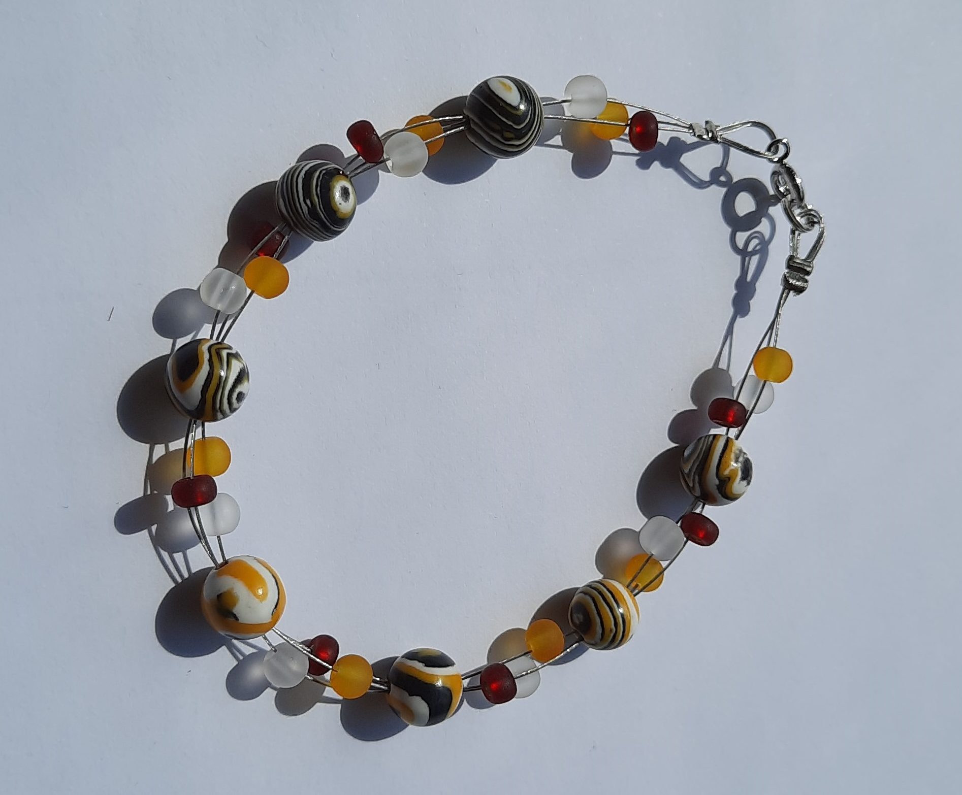 Schönes, originelles Armband aus Malachit- und Glasperlen mit drei Drähten ineinander verschlungen.